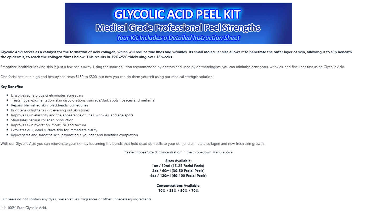 GLYCOLIC ACID CHEMICAL FACE PEEL Kit Medical Grade 100% Pure Acne Scars Wrinkles